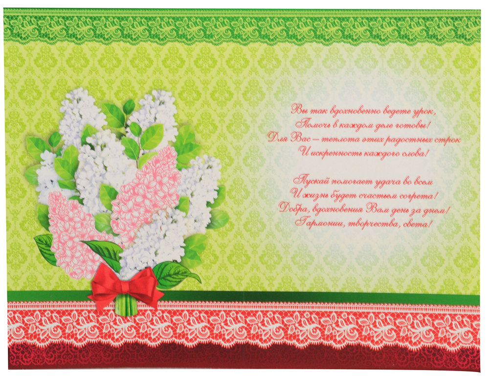 Красочная открытка с поздравлением в стихах. Красивый подарок ко Дню учителя, выпускному или к другим торжествам! Поздравление уже напечатано на внутренней стороне, Вам остается только подписать ее и вручить.