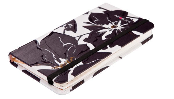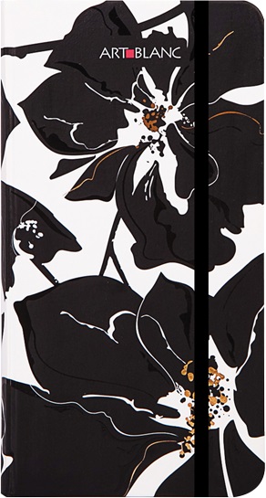Черно-белый цветочный дизайн записной книжки одновременно нарядный и классический. Лаконичное цветовое сочетание уравновешивается изящными линиями и нетривиальным рисунком. Пышные женственные цветы, похожие на орхидеи, декорированы лаком и фольгой