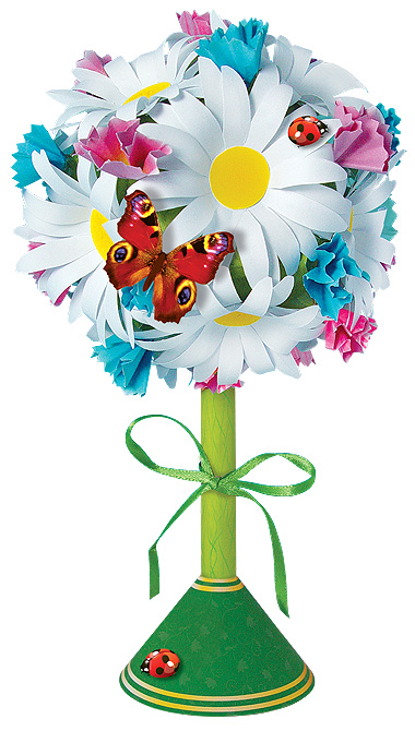 Деревце-топиарий могут сделать дети от 8-ми лет, - это несложно и увлекательно: сначала изготавливаются из бумаги цветы, а к ним дополнительные детали: бумага нарезается, сладывается, подрезается или скручивается. Затем из картона складывается основа для кроны и изготавливается ствол и подставка. Собрав все картонные детали, украшаем шарообразную крону цветами и бабочками, божьими коровками; а ствол - яркой атласной лентой. Декоративные деревья, созданные в технике «Бумагопластика», словно из волшебного сада, появятся у вас в доме и будут украшать его круглый год!