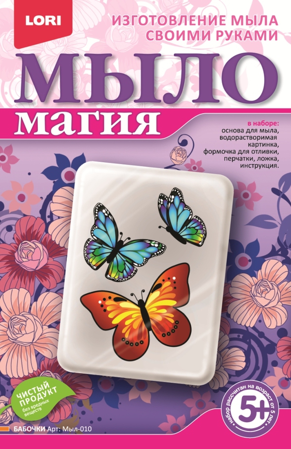 Набор для создания мыла собственными руками. Процесс изготовления прост, но требует помощи взрослых. Набор рекомендуется для детей старше 5 лет.