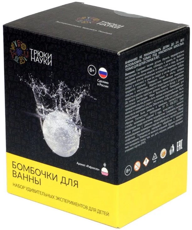 Все, что нужно для создания бомбочки, уже есть в комплекте. Вы сможете сделать для близкого человека сувенир с приятным ароматом конфет «Рафаэлло». Такой подарок запомнится надолго, ведь он сделан своими руками. Интересный научный эксперимент понравится ребенку и познакомит его с необычными свойствами бытовых веществ.