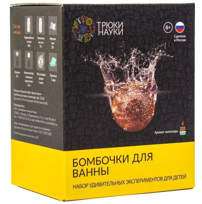 Бомбочки для ванны – это веселые шипучки, которые растворяются в воде, наполняя ее полезными минералами, эфирными маслами и приятными ароматами. Они также оказывают расслабляющий эффект массажа. С данным набором вы сделаете такую бомбочку своими руками, и она наполнит вашу ванную чудесным запахом шоколада.