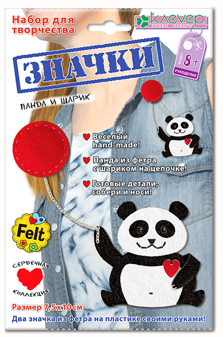 Забавная "Панда с шариком" - популярный среди молодежи стилизованный под игрушку значок из фетра. Ребёнок старше 8 лет легко пришьёт бисеринки-глазки и ротик на готовые детали из цветного фетра, вставит английскую булавку в деталь из пластика и склеит значки как сэндвич из фетра, двусторонней самоклеящейся плёнки и пластика, изготовит из фетра и мягкого наполнителя объёмный шарик и соединит его с помощью ювелирной цепочки с пандой. Пришитая пайетка-сердце придаст фигурке панды очарование. Клей и ножницы не понадобятся! Этот оригинальный дизайнерский значок будет отлично смотреться на одежде!