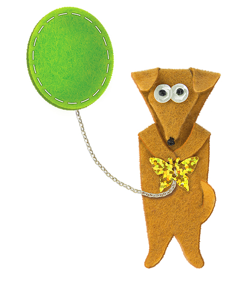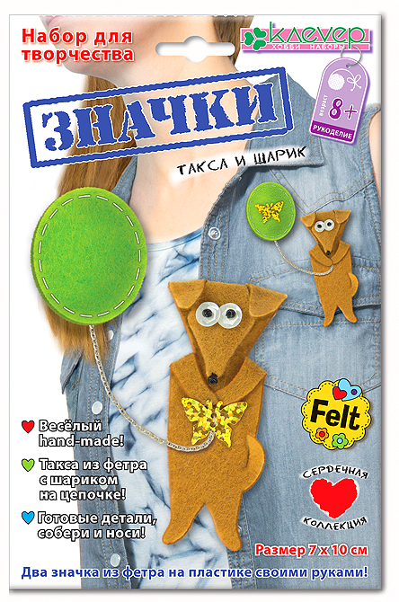 Забавная "Такса с шариком" - популярный среди молодежи стилизованный под игрушку значок из фетра. Ребёнок старше 8 лет легко пришьёт "глазки" из пайеток с бисеринками и вышьет двумя стежками "ротик" на готовых деталях из фетра, вставит английскую булавку в деталь из пластика, изготовит из фетра и мягкого наполнителя объёмный шарик и соединит его с помощью ювелирной цепочки с лапками таксы. Пришитая пайетка-бабочка придаст фигурке таксы очарование. Клей и ножницы не понадобятся! Этот оригинальный дизайнерский значок будет отлично смотреться на одежде!