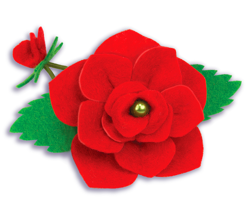 Роза - эффектное и яркое украшение. Алый объёмный цветок из мягкого фетра отлично смотрится в волосах, стягивая хвост или косу. Его можно прикрепить на ободок для волос или пришить на кофточку или сумочку. Рукодельнице старше 8 лет будет несложно сделать его, нужно только обладать начальными навыками кройки и шитья: вырезать из фетра по выкройке детали цветка, сделать складки у лепестков и сшить детали между собой, нашить жемчужную бусину и прикрепить к резинке по инструкции. Созданный своими руками дизайнерский цветок украсит причёску, а само его создание доставит большое удовольствие!