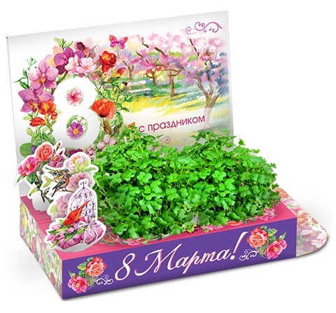 Живая открытка - это удивительный и очень красивый подарок. Маленький садик на вашем столе будет радовать зеленью и зимой, и летом.Открытка представляет собой коробочку, с одной стороны есть место для написания ваших пожеланий.Откройте открытку, высыпьте семена в контейнер, где находится специальный материал для проращивания. Уже через 3-4 дня в открытке вырастет пышный газон из зелени. В комплекте вы найдете 3 тематические фигурки. Их можно разместить рядом с газончиком, вставив в специальные отверстия, а можно поставить прямо в травку. Не забывайте поливать ваш мини-садик, и он долго будет радовать вас.