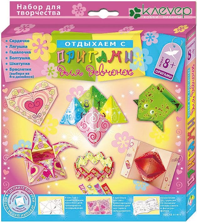 Набор фигурок-оригами для девчонок предлагает сложить занимательные симпатичные игрушки из листа бумаги. Техника оригами благоприятно влияет на развитие мелкой моторики, конструктивное мышление ребенка, а так же улучшает концентрацию внимания и развивает воображение. В наборе представлены: сердечко, лягушка, гадалочка, болтушка, шкатулка, браслетик.
