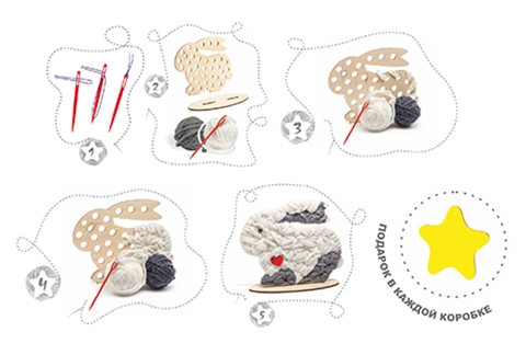 Вденьте пряжу в ушко безопасной пластиковой иглы и начните обвязывать деревянную заготовку, продевая нить через отверстия. Делайте петли свободными, чтобы готовая фигурка получилась пушистой. Комбинируйте цвета пряжи и сами решайте, каким будет окрас вашего кролика. Для самых увлеченных творцов мы приготовили подарок – деревянный значок, который можно раскрасить самостоятельно и получить самый оригинальный аксессуар. Наборы этой серии отличаются высоким качеством материалов и хорошей идеей для творчества, которая гарантированно заинтересует покупателей.