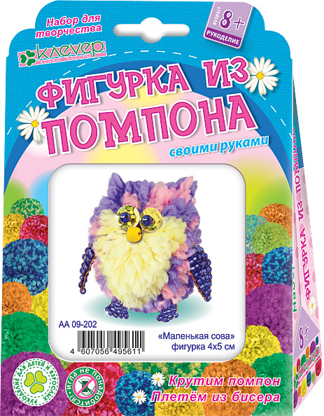 Маленькая пушистая сова с удивлёнными глазками, крылышками, лапками и хвостиком из блестящего бисера - милая игрушка или брелок. Рукодельница старше 8 лет может изготовить его с помощью набора "Маленькая сова": нужно скрутить помпон из разноцветной пряжи, используя картонные шаблоны, сплести из бисера по схемам лапки, крылья, хвостик и глазки-пайетки с носиком, соединить всё в единую фигурку, - и сова готова. Маленькую сову можно подарить, как небольшую игрушку или брелок.