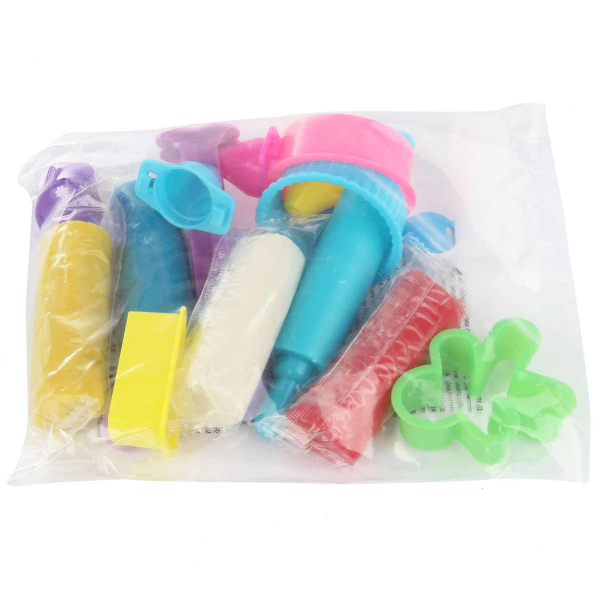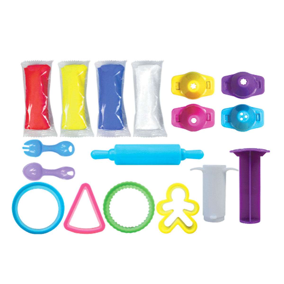 - В наборе: тесто для лепки, 4 фигурные формы, кондитерский шприц с 4 насадками, скалка, ложка, вилка