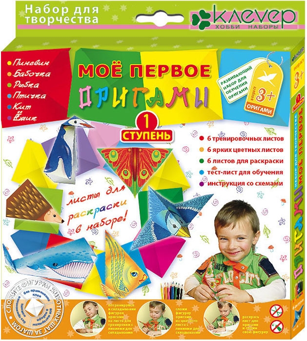 Набор серии "Моё первое оригами. Ступень 1" познакомит ребёнка с оригами и рисованием и продемонстрирует ему, насколько это увлекательное занятие. Малыш научится складывать основные линии оригами на тест-листе, сложит забавные фигурки животных сначала на тренировочных, затем – на цветных листах.