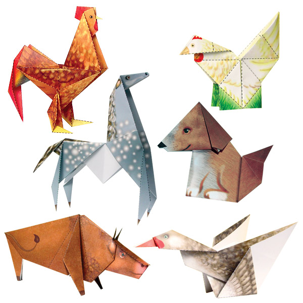 Фигурки, которые предлагаются в наборе: бык, гусь, петух, собака, лошадь, курица. В помощь родителям предлагается книжка-инструкция, где даны рекомендации по работе с набором, основные приемы и история техник раскрашивания и оригами.