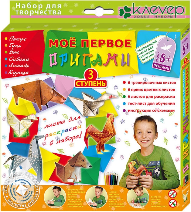 Набор серии "Моё первое оригами. Ступень 3" рассчитан на детей старше 8 лет, которые продолжают знакомиться с техникой оригами. Так же, как и в предыдущих наборах, ребёнок осваивает две техники – оригами и рисование. Он учится складывать основные линии оригами на тест-листе, складывает фигурки животных сначала на тренировочных, затем на цветных листах. Ребёнок может сам раскрасить фигурку на листе-раскраске карандашами, передав характерную именно для этого животного окраску.