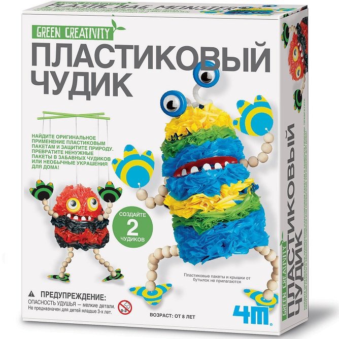 Делайте необычные игрушки и спасайте планету от загрязнения! Этот познавательный набор от компании 4М подскажет, как использовать пластиковые пакеты. С помощью инструкции на русском языке и аксессуаров из набора ребенок сделает забавных чудиков своими руками. Дополнительно понадобятся разноцветные пластиковые пакеты и крышки от бутылок, которые обычно отправляются в мусор.