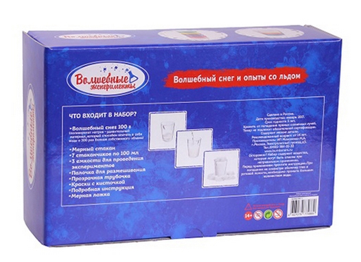 В наборе вы найдете инструкцию на русском языке с описаниями опытов и увлекательными рассказами о свойствах снега и льда. В комплекте уже есть все нужные ингредиенты для работы, а также несколько пакетиков Волшебного снега. Просто добавьте немного воды и наблюдайте за тем, как снег за секунды увеличивается в размерах. Вы сможете покрасить его в любой цвет или сочетать друг с другом разные оттенки. Данный набор для проведения опытов – увлекательная игра для всей семьи, полезный набор для учебы и творчества, а также прекрасный подарок для детей и взрослых.