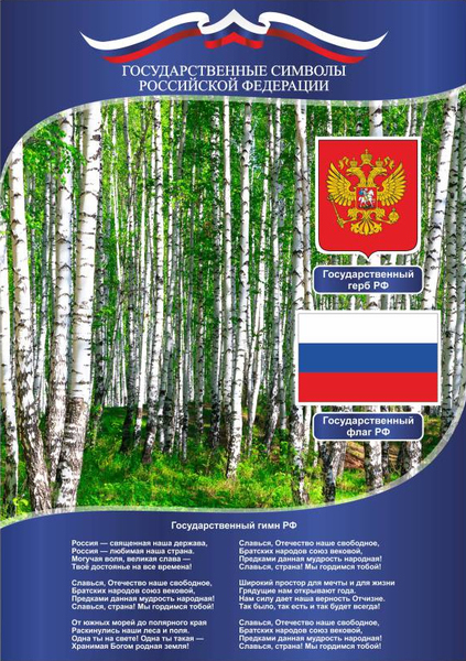Плакат с государственной символикой Российской Федерации. Идеально подходит для использования в детских, школьных учреждениях, а также в офисах. Высокое качество печати, строгий дизайн подчеркивают важность и статусность главных символов страны.