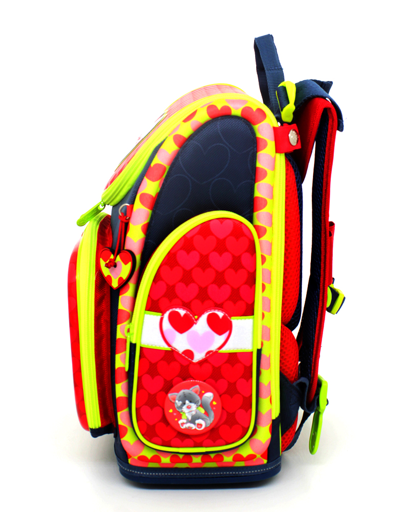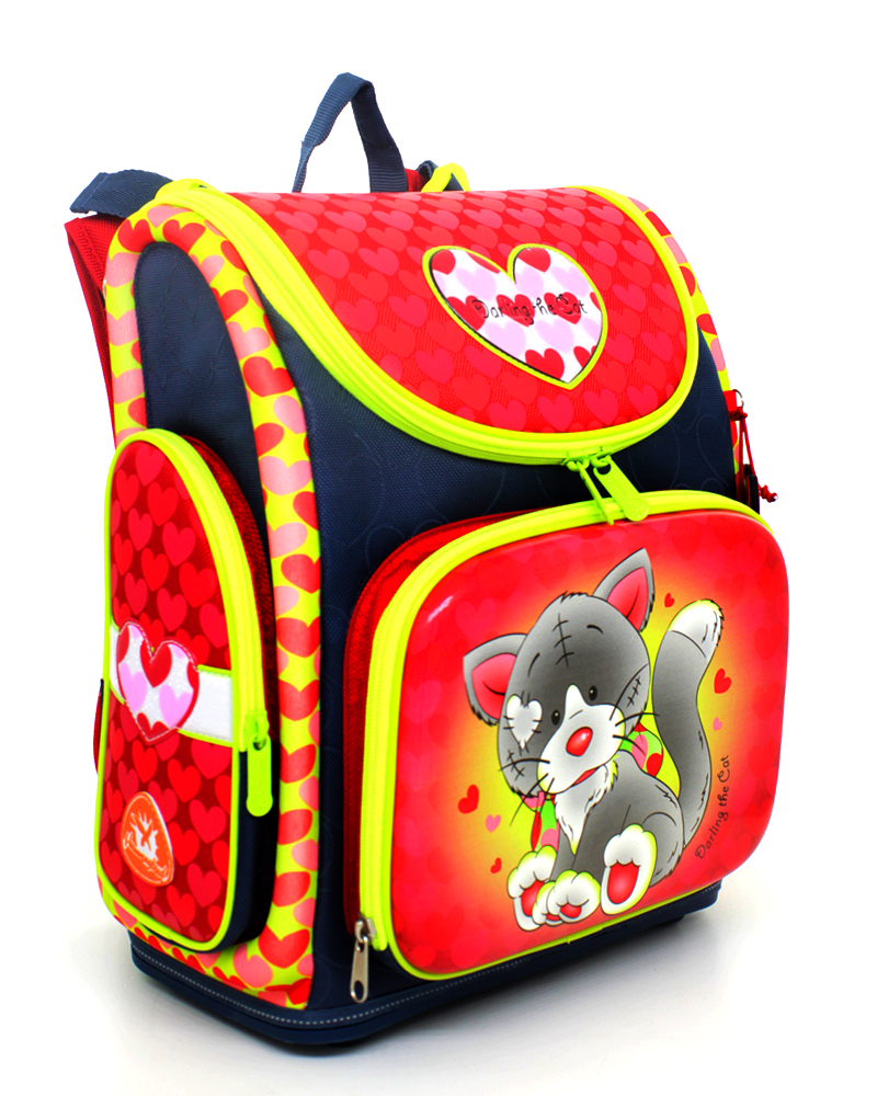 Ранец имеет одно большое основное отделение на молнии (куда легко помещается папка для труда). Внутри основного отделения расположены перемычки для комфортного размещения тетрадей и учебников. Так же ранец имеет три удобных кармана, два боковых для мелких предметов и один передний. В переднем кармане расположен многофункциональный органайзер. Он включает в себя карман для мобильного телефона, сетчатый карман для мелочей, отделения для ручек и карандашей, подвеску для ключей.