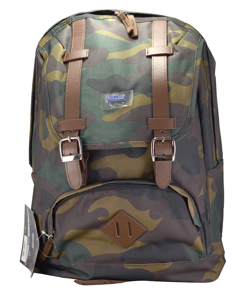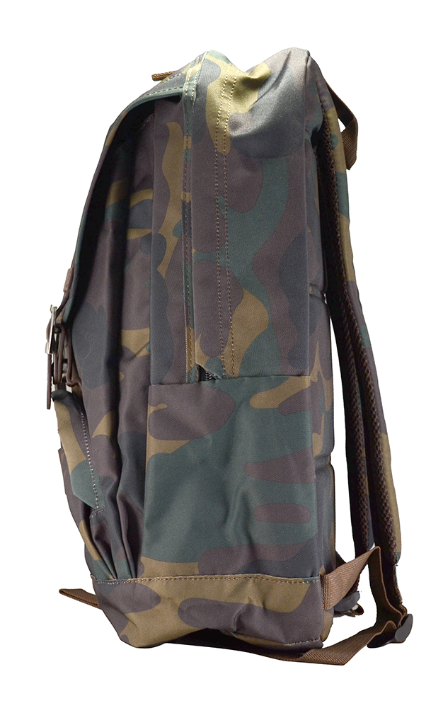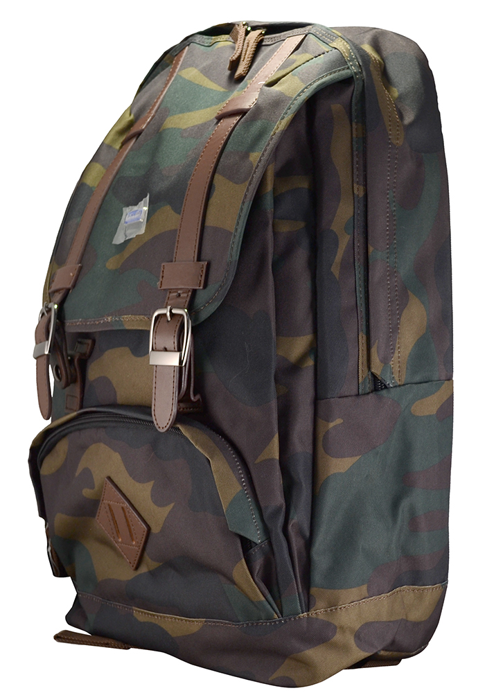 - Передняя стенка рюкзака представлена в виде накладного кармана, образующего дополнительное отделение рюкзака, закрывающееся фигурным клапаном с декоративными ремешками из искусственной кожи на магнитные кнопки.