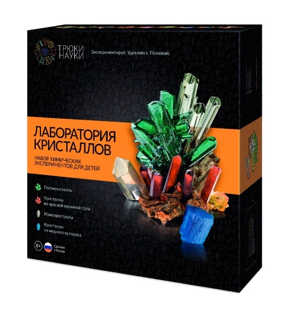 Создавайте завораживающие кристаллы с помощью науки! Данный набор позволит вам вырастить 4 разных вида кристаллов, полученных из разных веществ и реагентов. Для каждого из них подготовлен свой уникальный эксперимент. У набора богатая научная составляющая, которая представлена в виде увлекательной игры.