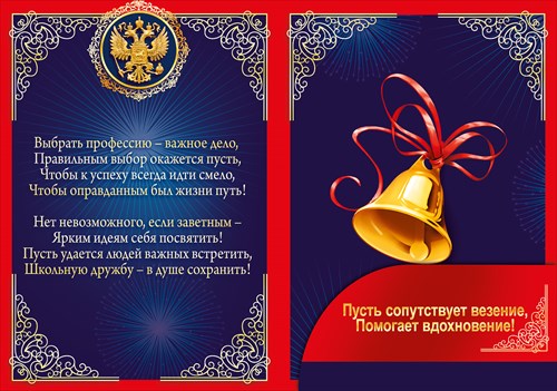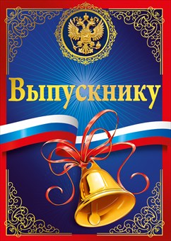 Красочная открытка большого формата с поздравлением в стихах. Красивый подарок выпускникам школ! Поздравление уже напечатано на внутренней стороне, Вам остается только подписать ее и вручить в торжественной обстановке, а также внутри специальный кармашек, в который можно вложить дополнительно грамоту или диплом.