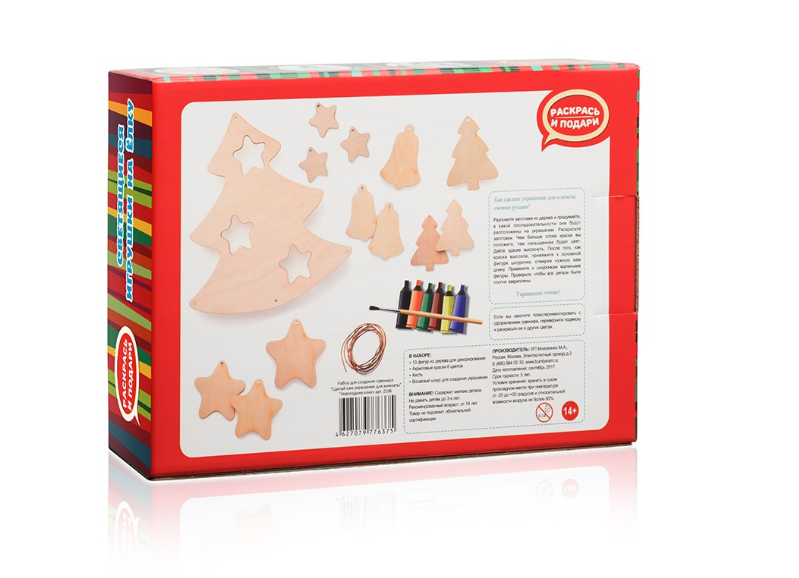 - В наборе: деревянные заготовки для раскрашивания, краски и кисть, шнур для сборки подвески