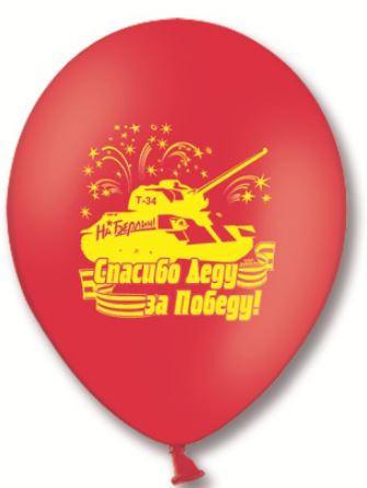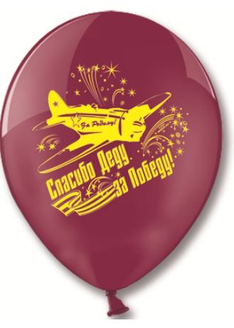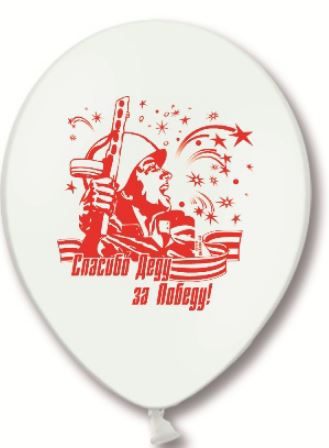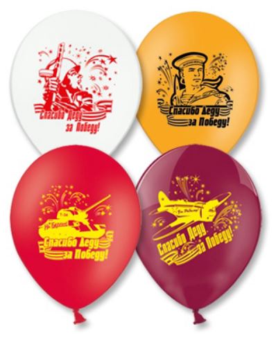Высококачественный шар из натурального латекса. Ассорти из 10-12 цветов (в случайном соотношении), одного типа - пастель - матовый оттенок цвета. Шары с двусторонним шелкографическим рисунком на тему "День Победы", "9 Мая", "Спасибо Деду за победу!" с большим полем печати.