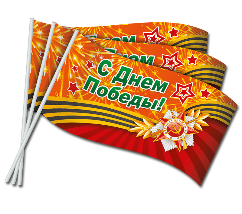 Оформительский флажок на пластиковом древке с ярким принтом на тему празднования Дня Победы.