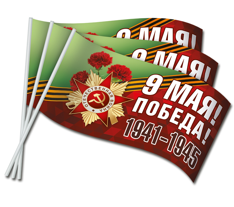 Оформительский флажок на пластиковом древке с ярким принтом на тему празднования Дня Победы.