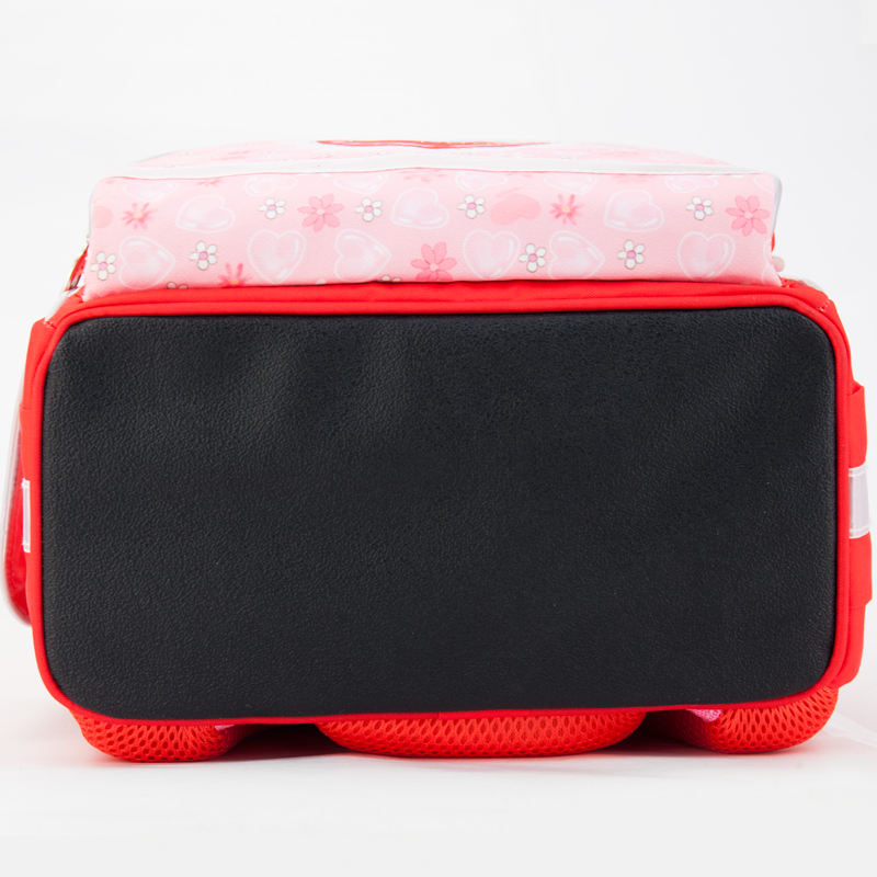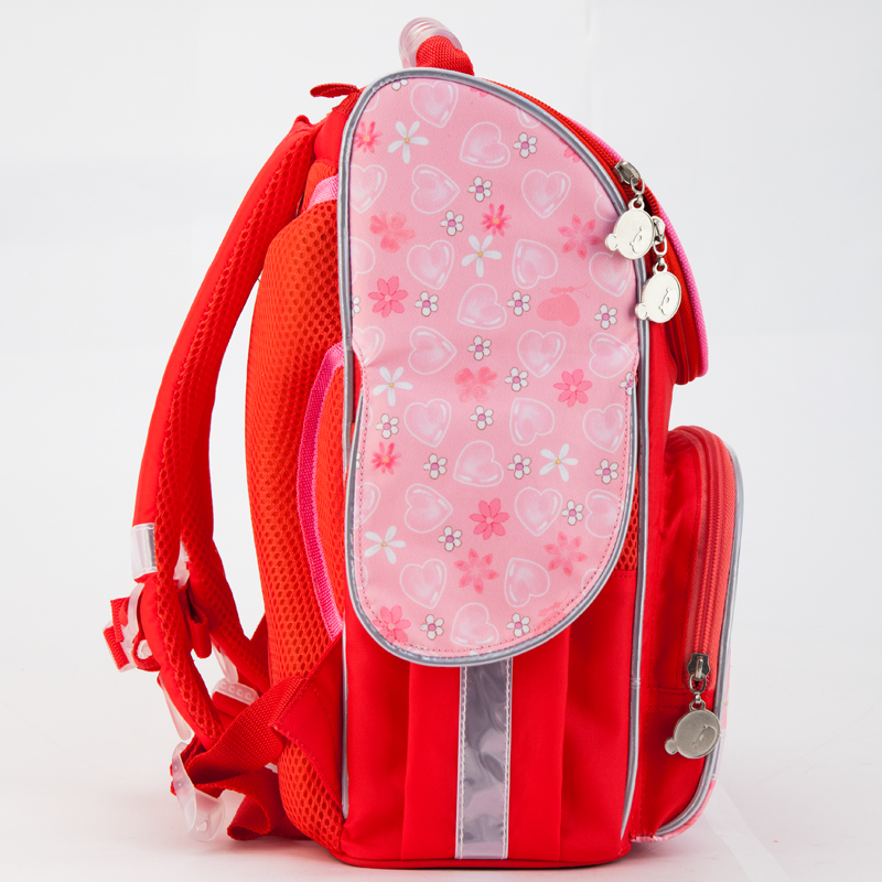 Рюкзак для девочек младшей школы выполнен из прочного полиэстера розового цвета с изображением мишки.