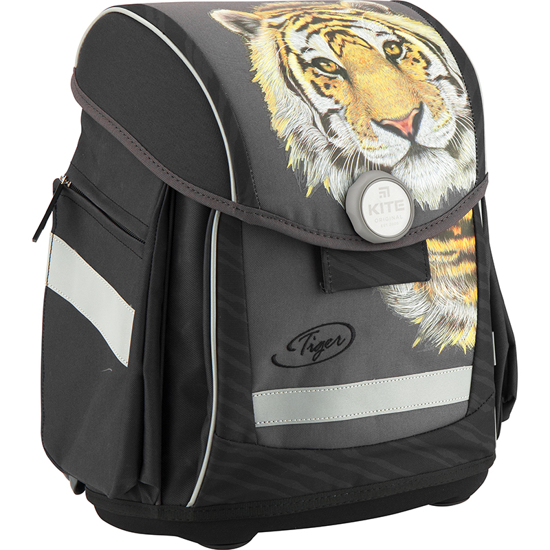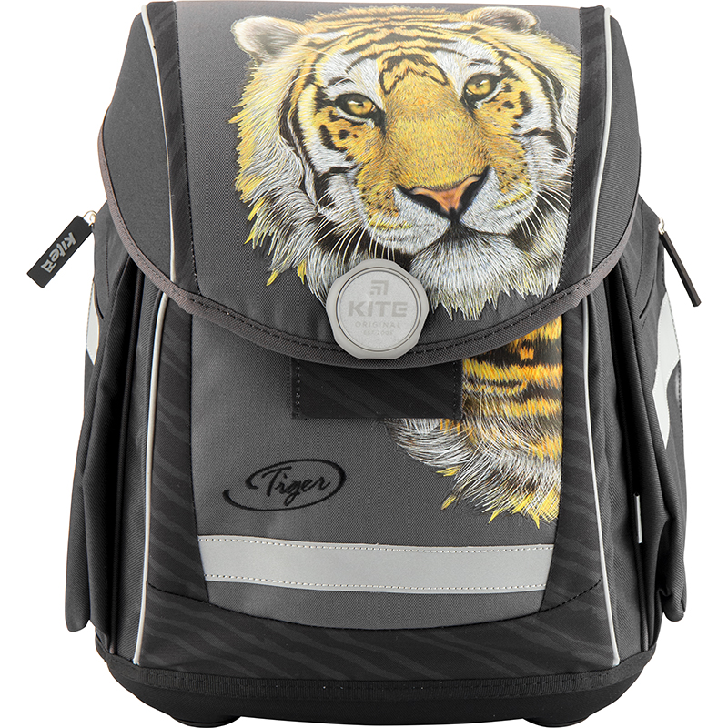 Рюкзак Kite K18-578S-2 для мальчиков младшей и средней школы выполнен из прочного полиэстера серого и черного цветов с изображением тигра.