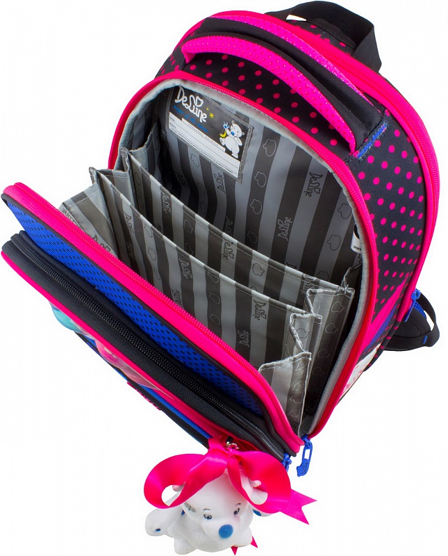 - Ранец имеет 3 отделения и карман для пенала, при открытии центрального отделения раздвигаются разделители (книжка). В переднем отделении можно удобно разместить классические тетради и другие принадлежности для школы.