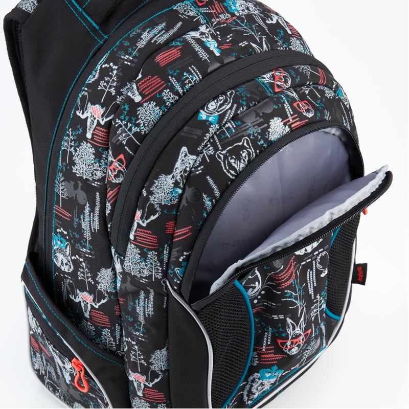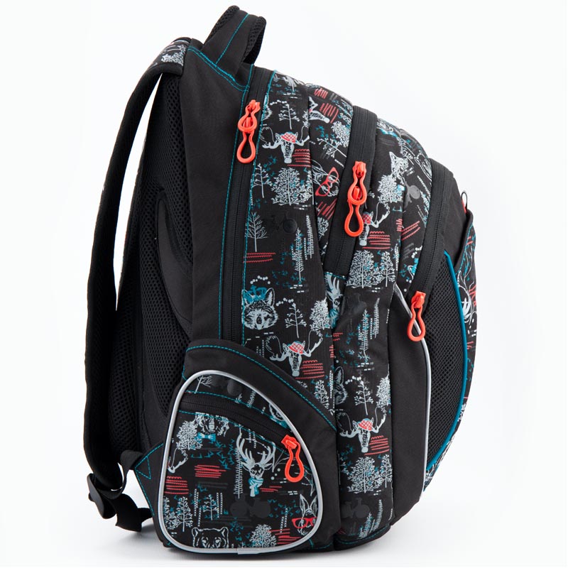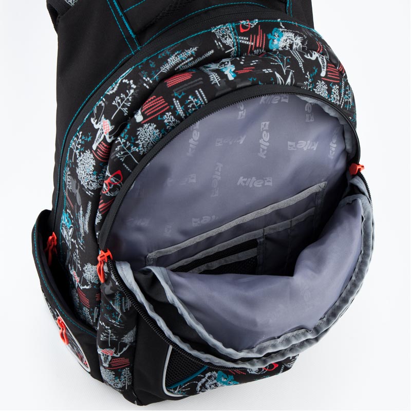 Рюкзак состоит из 2 отделений, 2 передних, внутреннего и 4 боковых карманов, для бутылки с водой. Передний карман содержит удобный органайзер для канцелярии и личных вещей. Контрастная подкладка помогает быстро отыскать нужные вещи.