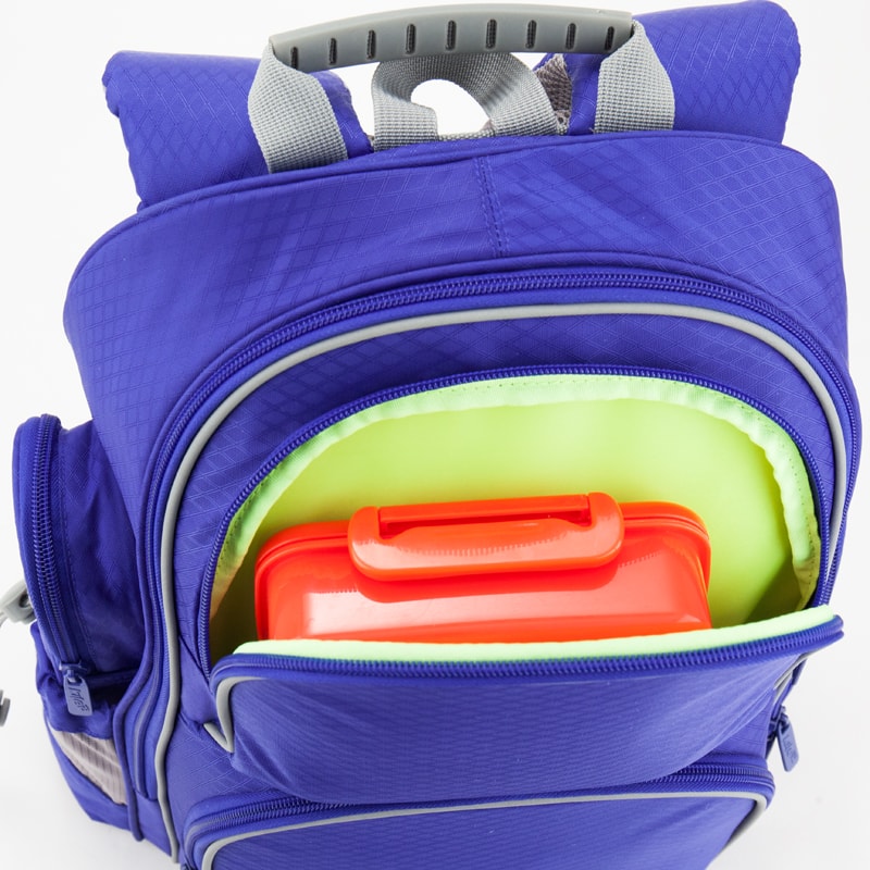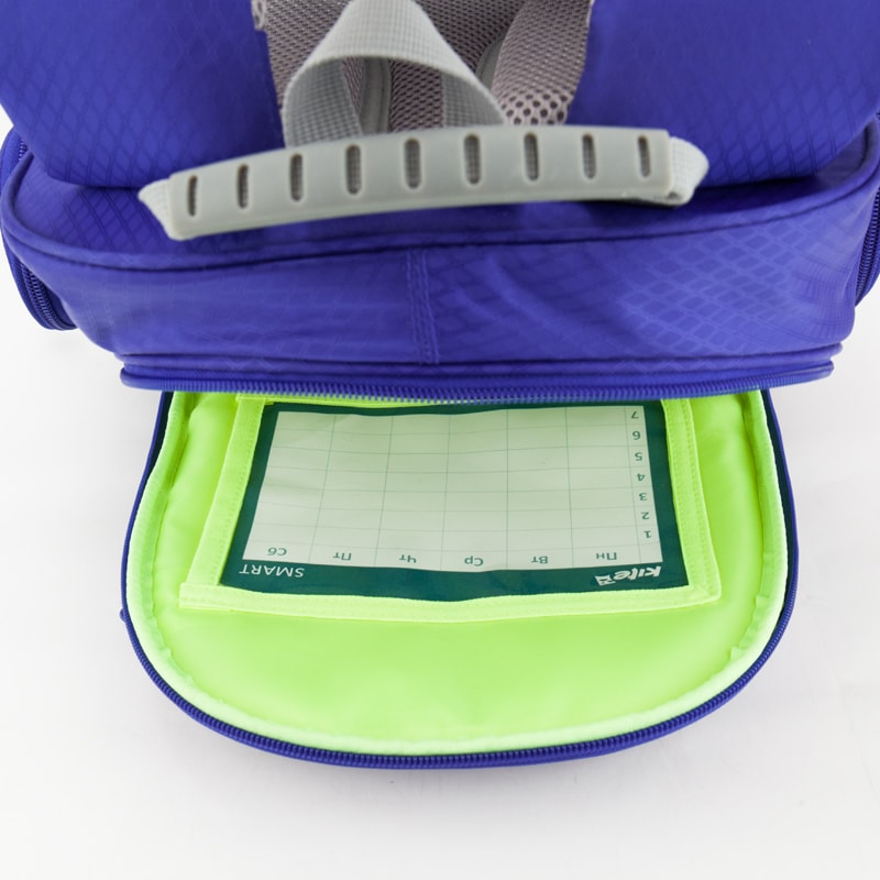 - Передний карман оснащен удобным органайзером из контрастной неоновой ткани, что позволяет систематизировать и легко находить в рюкзаке школьные принадлежности и личные вещи ребенка. А чтобы ребенок не потерял ключ от дома, вам достаточно его повесить на ключницу в органайзере. Еще одна удобная опция - расписание на внутренней стенке крышки рюкзака.