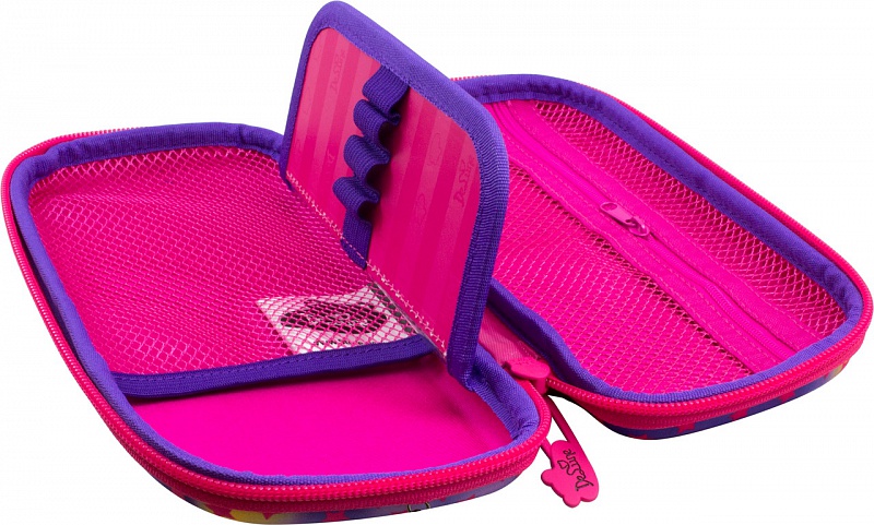 Пенал имеет одно большое отделение, разделенное перегородкой, на которой удобно можно разместить все ручки и карандаши, так же имеется удобное отделение-сеточка на молнии.
