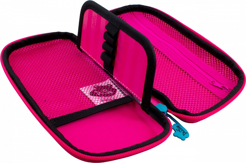 Пенал имеет одно большое отделение, разделенное перегородкой, на которой удобно можно разместить все ручки и карандаши, так же имеется удобное отделение-сеточка на молнии.