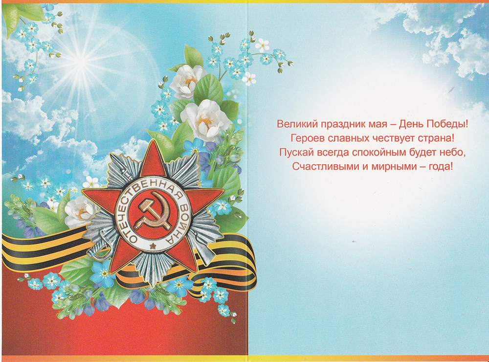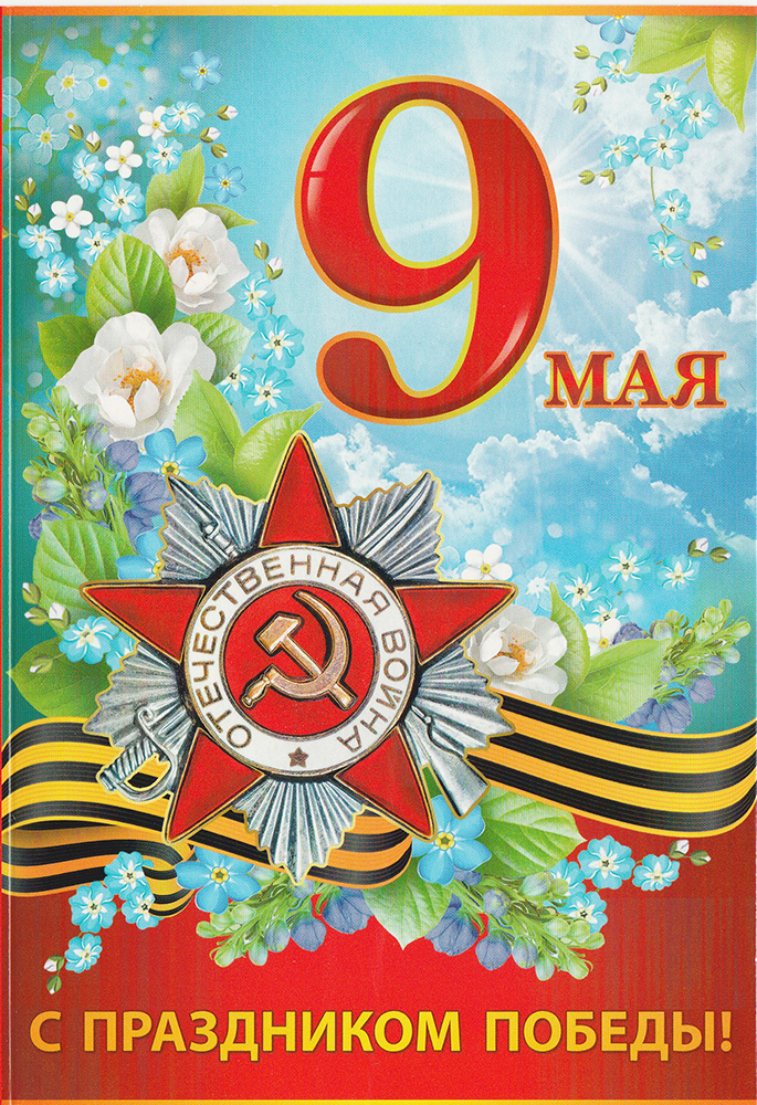 Красочная открытка с конвертом. Практичный подарок к празднику 9 мая! Поздравление уже напечатано на внутренней стороне, Вам остается только подписать ее и вручить.