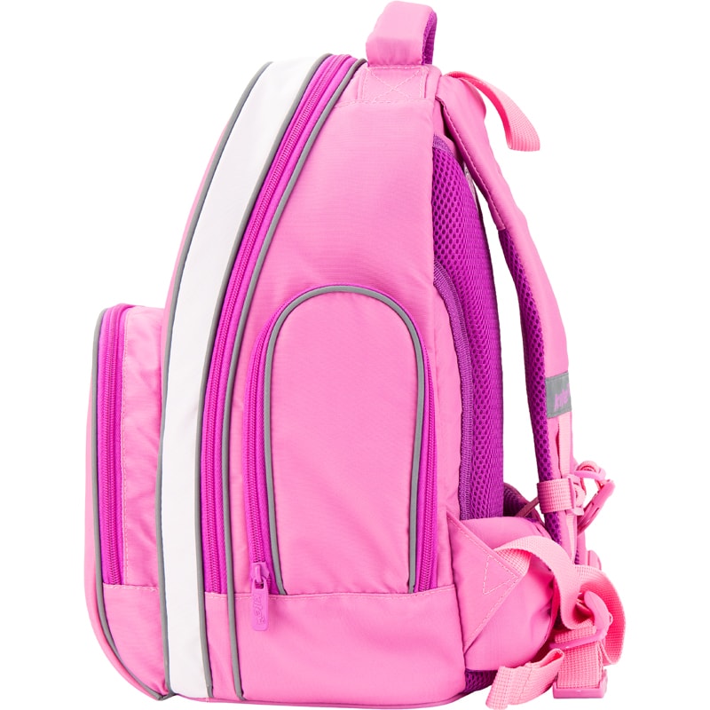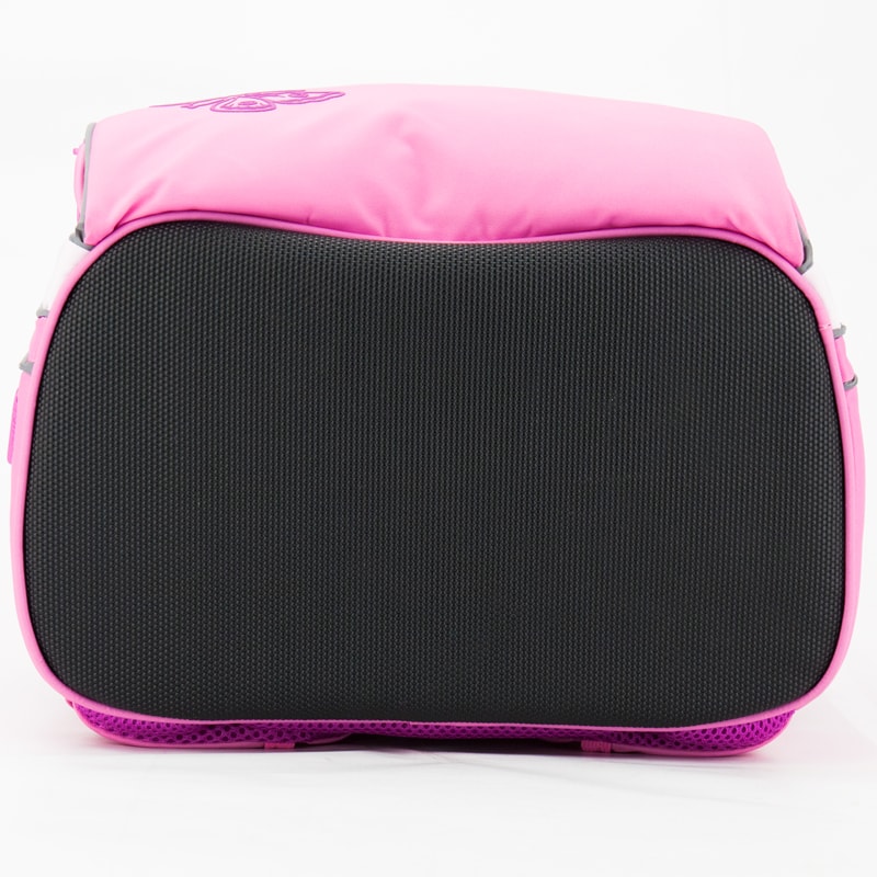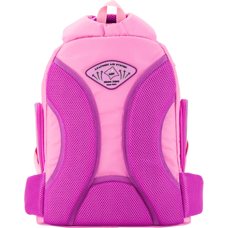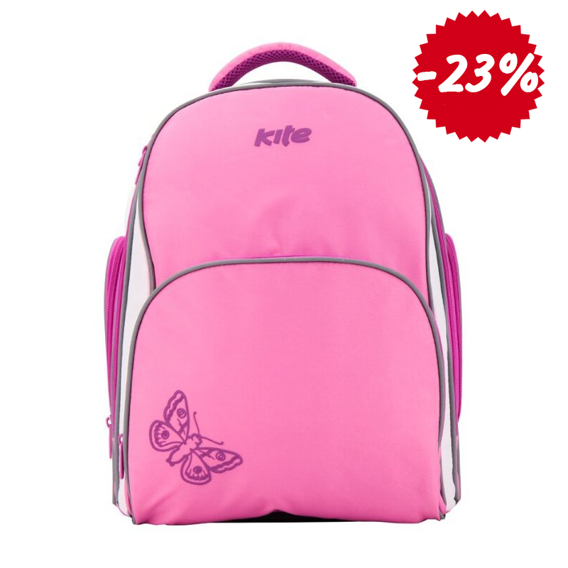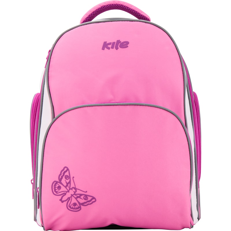 Рюкзак для девочек младшей и средней школы выполнен из прочной кордуры розового цвета с изображением бабочки в нижнем углу.