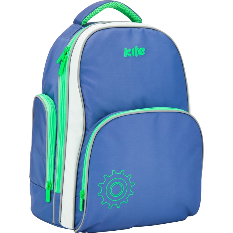 Рюкзак для мальчиков младшей и средней школы выполнен из прочной кордуры синего цвета с изображением шестеренки в нижнем углу.