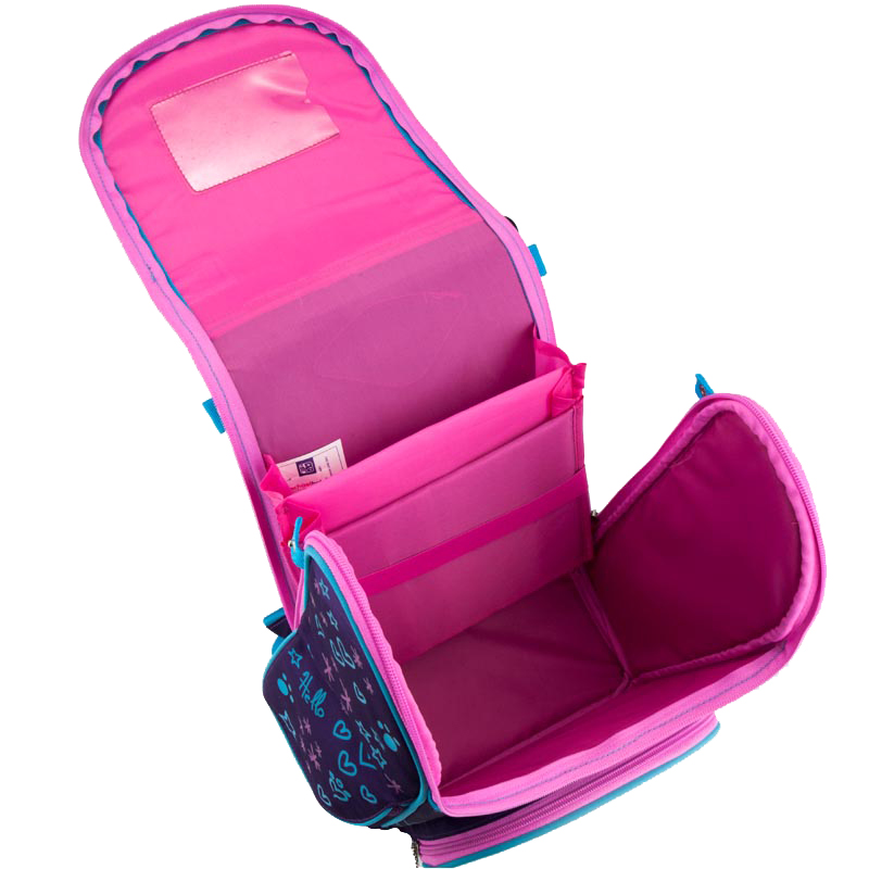 Рюкзак состоит из просторного отделения, переднего и 2 боковых карманов на липучке, куда легко помещается бутылочка для воды. Внутренние разделители для книг и тетрадей позволяют правильно организовать пространство в рюкзаке. Рюкзак-трансформер открывается на 180 градусов, это позволяет достать маленькие вещи со дна рюкзака и хорошенько его почистить. На внутренней стороне крышки рюкзака есть специальное место для расписания.