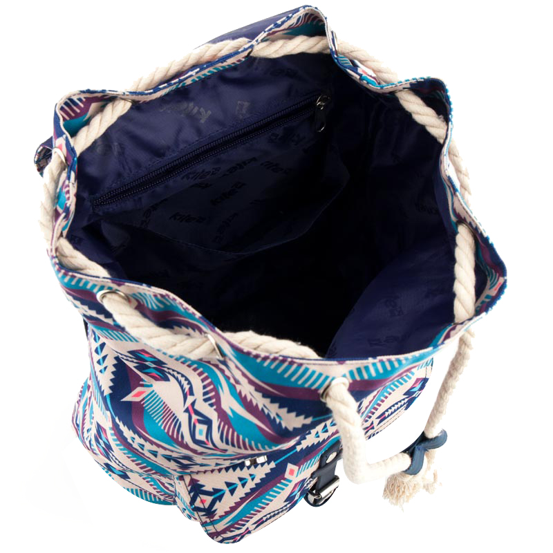 Рюкзак состоит из просторного отделения, переднего и 2 внутренних карманов. Отделение утягивается на толстом плетеном шнурке и закрывается на магнитных кнопках, скрытых под декоративными пряжками из синей эко-кожи. Передний карман декорирован аналогично основному отделению.
