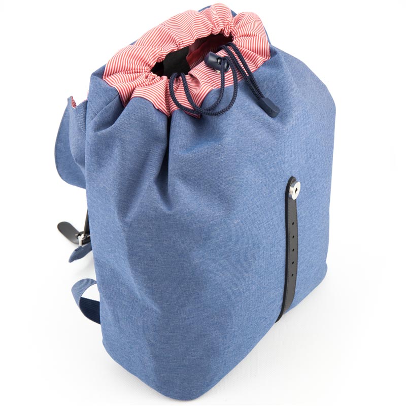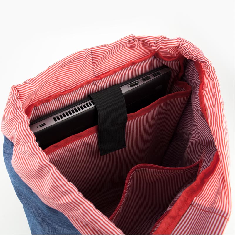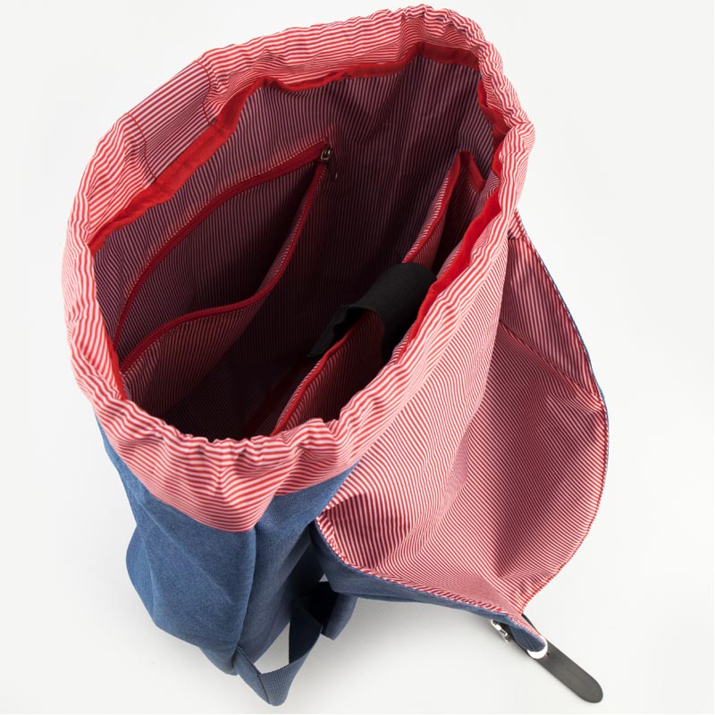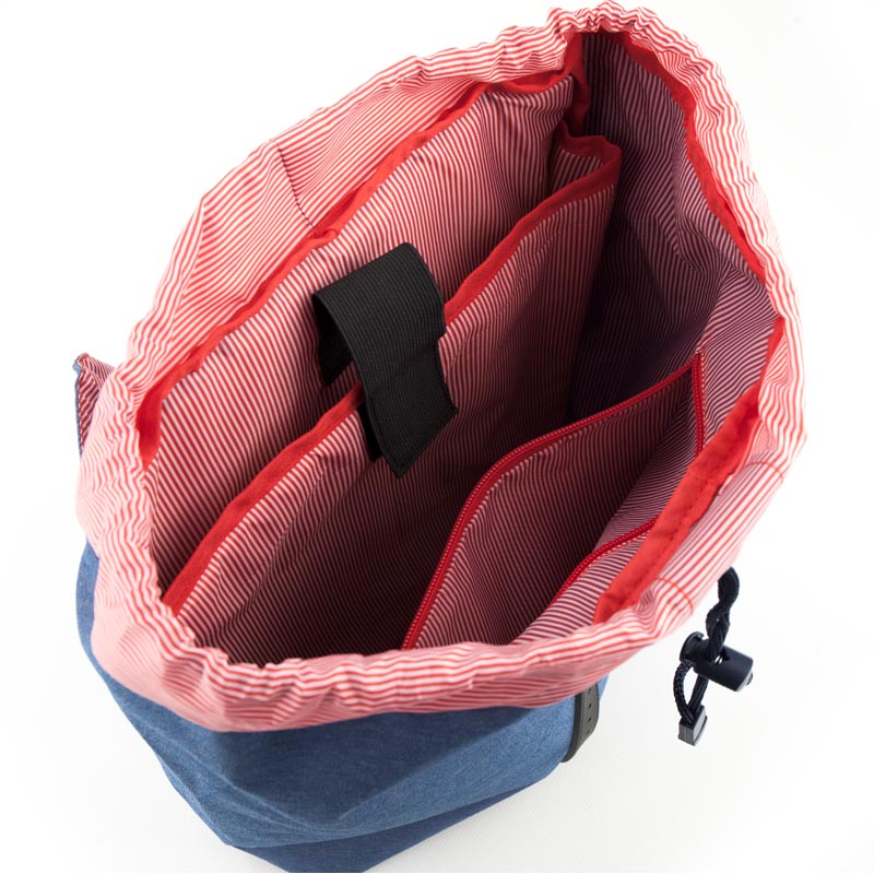 Рюкзак состоит из просторного отделения, кармана для ноутбука и внутреннего кармана. Отделение утягивается на шнурке и закрывается на магнитной кнопке. Магнитная кнопка скрыта под декоративной пряжкой из черной эко-кожи.
