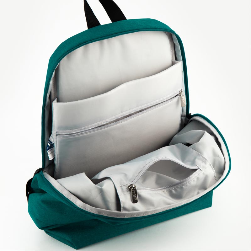 Рюкзак состоит из просторного отделения, плоского внутреннего кармана, куда поместится ноутбук, переднего, переднего и 2 внутренних карманов на молнии. Объем рюкзака может расширяться с помощью боковых резинок.