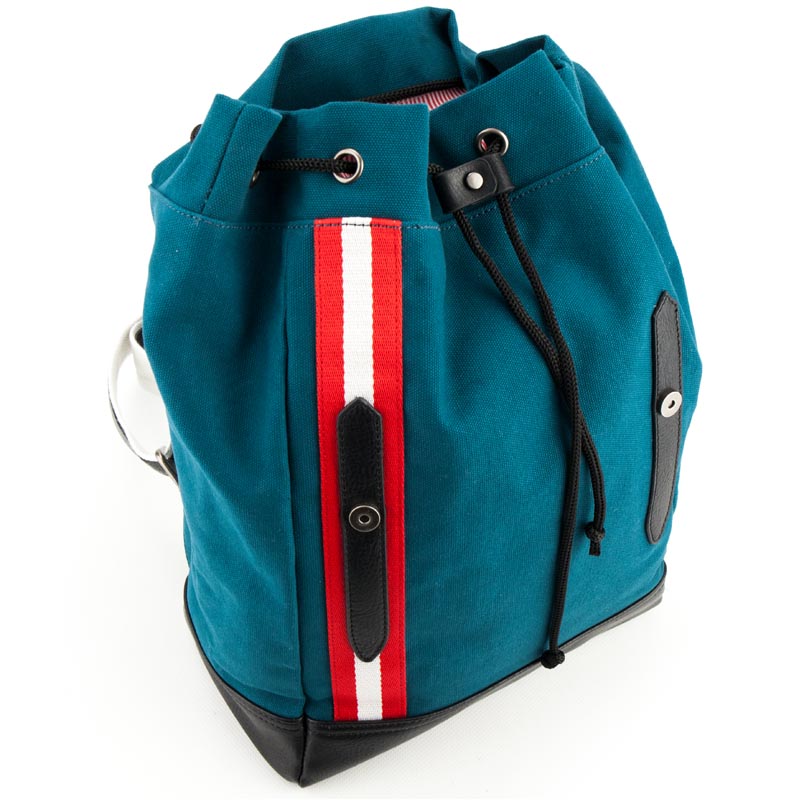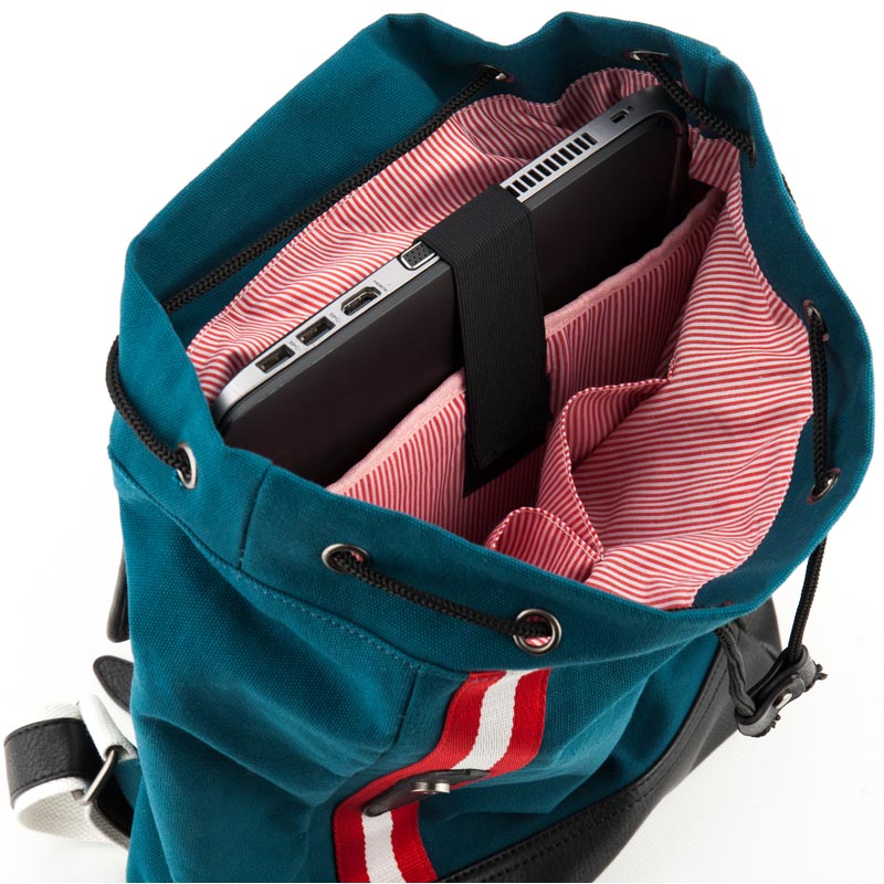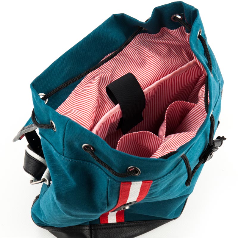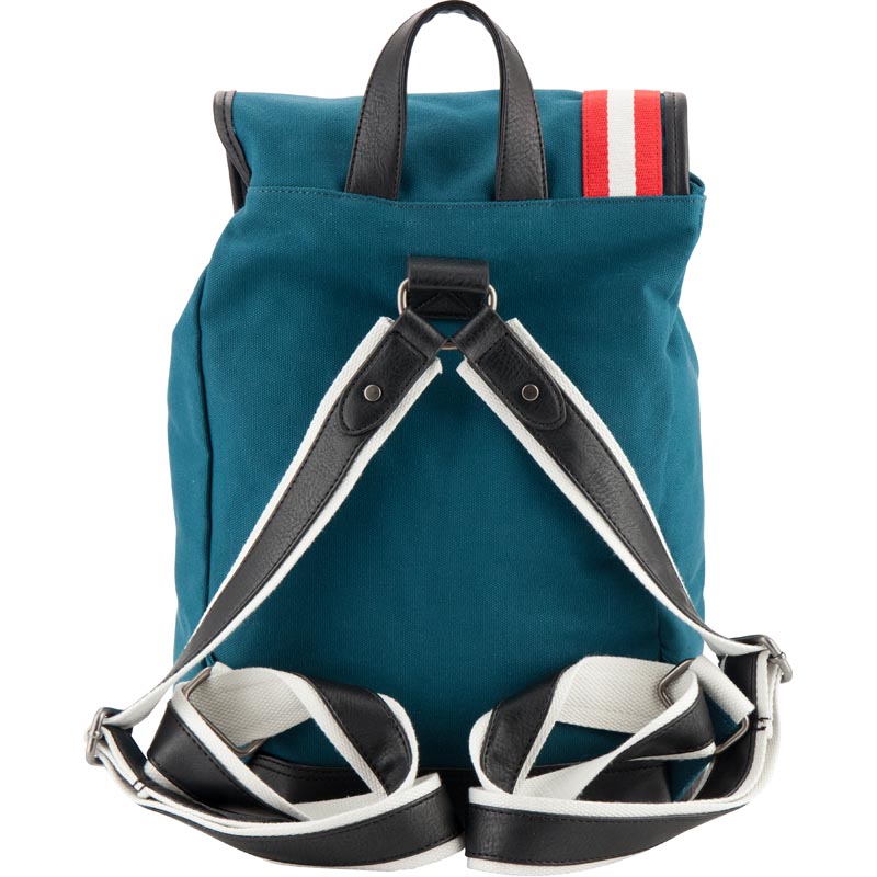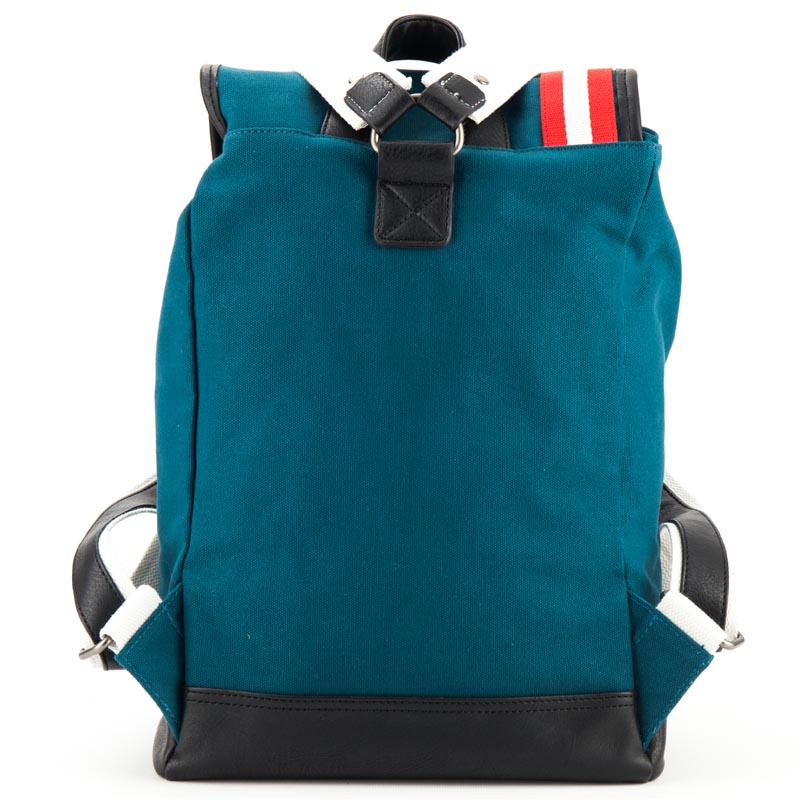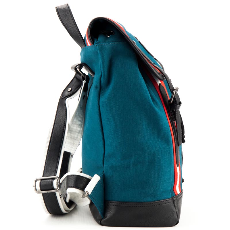 Регулируемые лямки и малый вес, всего 925 г, делают рюкзак комфортным для пользователей. Имеет ручку-петлю. Дно рюкзака, лямки, ручка-петля и ремни выполнены из эко-кожи. Фасад рюкзака украшен сине-красным веббингом на белом фоне.