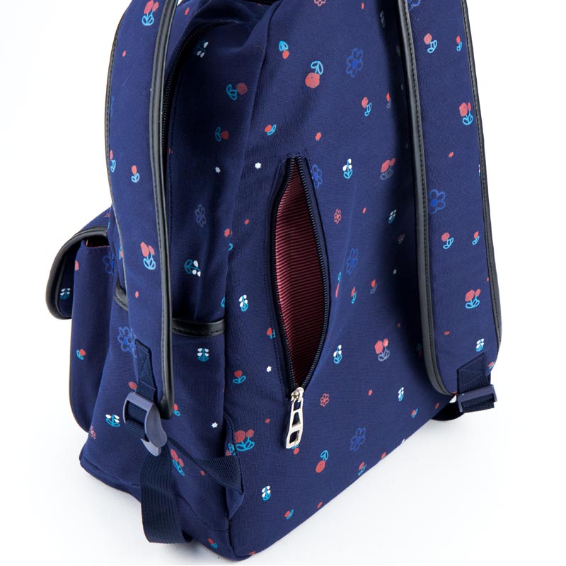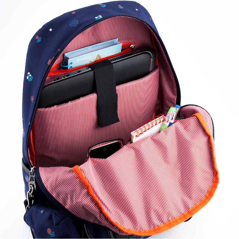 Рюкзак состоит из просторного отделения, кармана для ноутбука, переднего, 2 открытых боковых и 3 внутренних карманов. Также, есть скрытый карман на молнии на спинке изделия. Передний карман закрывается на магнитных кнопках, скрытых под декоративными пряжками.