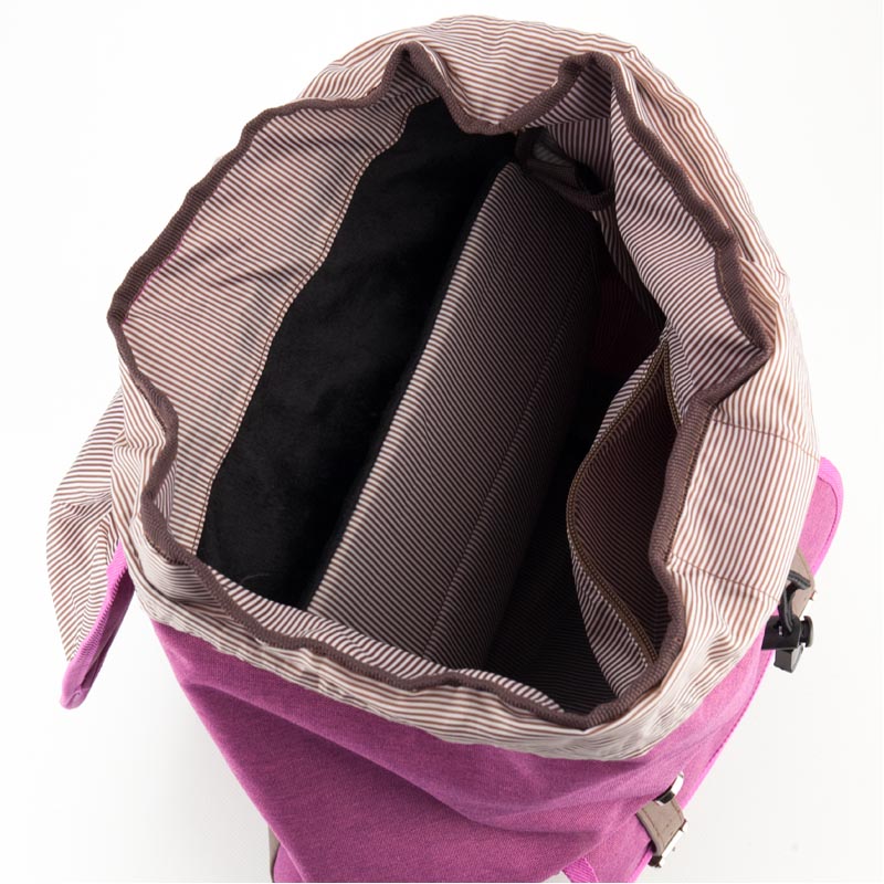 Рюкзак состоит из просторного отделения, термо-кармана для ноутбука, который расширяется с помощью боковых резинок, и 3 внутренних карманов. Отделение утягивается на шнурке и закрывается на скрытых магнитных кнопках. Магнитные кнопки скрыты под декоративными пряжками. Передний карман на молнии декорирован аналогично основному отделению.