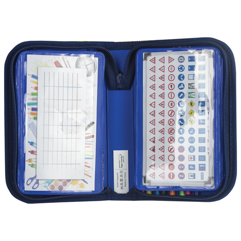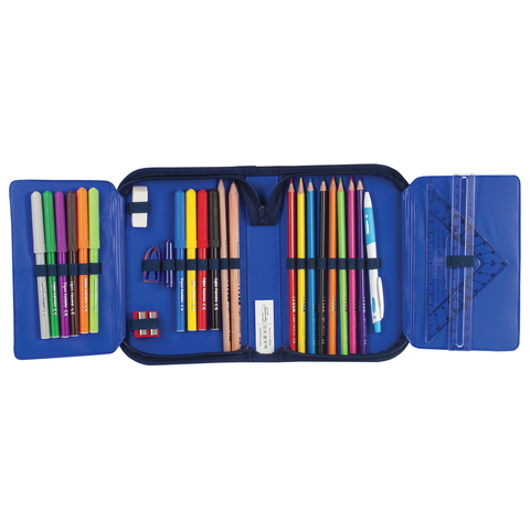 Благодаря двум откидным планкам в нём компактно размещаются все необходимые школьные принадлежности: автоматическая шариковая ручка, 8 мягких трёхгранных цветных карандашей, трёхгранный чернографитный карандаш средней жёсткости и утолщённый трёхгранный карандаш с мягким грифелем, 10 ярких фломастеров, ластик, точилка, угольник, линейка на 16 см, запасной колпачок, три зажима для бумаг, расписание уроков и карточка для запоминания дорожных знаков.