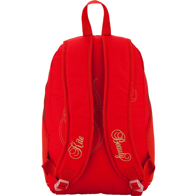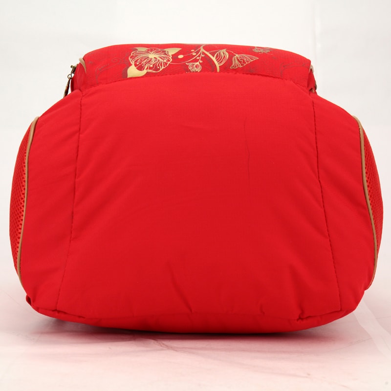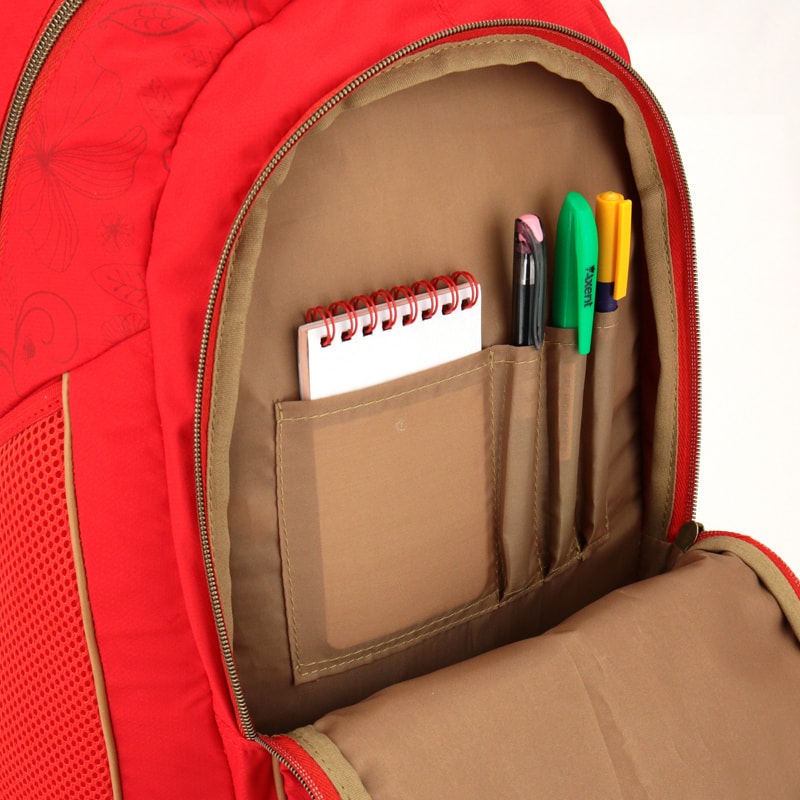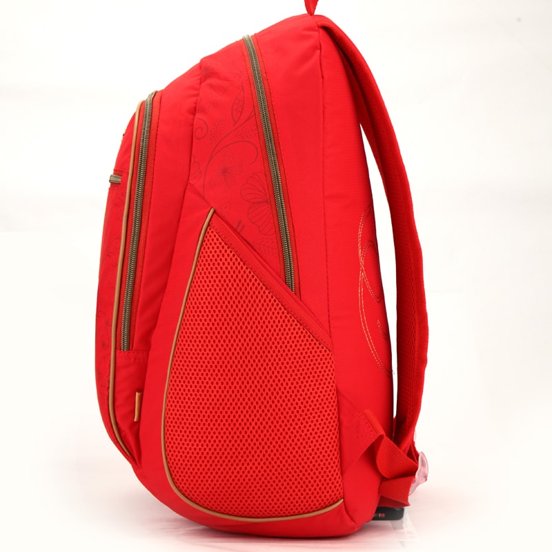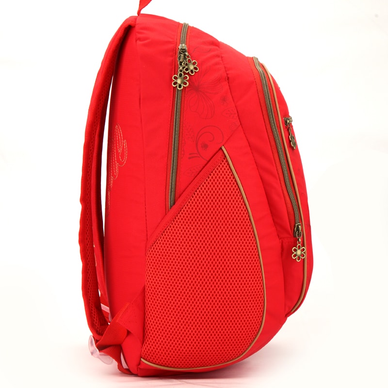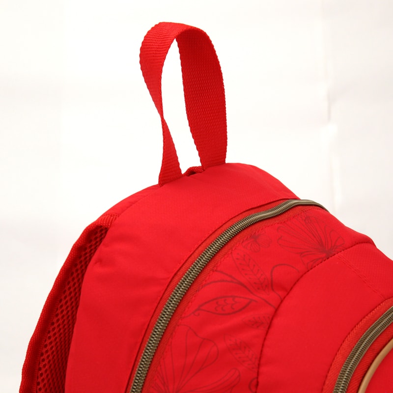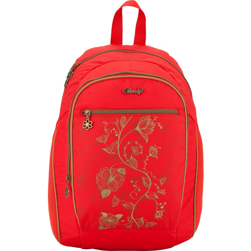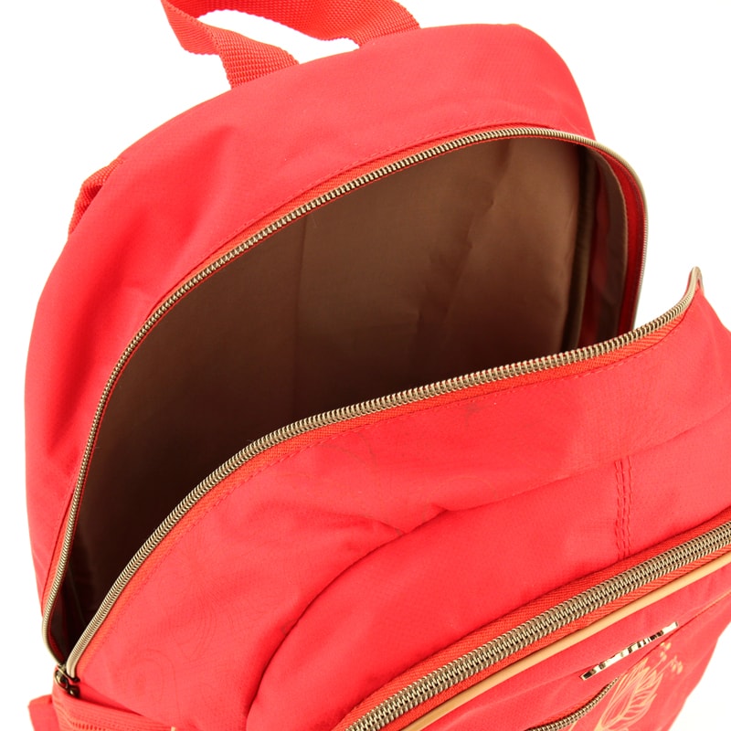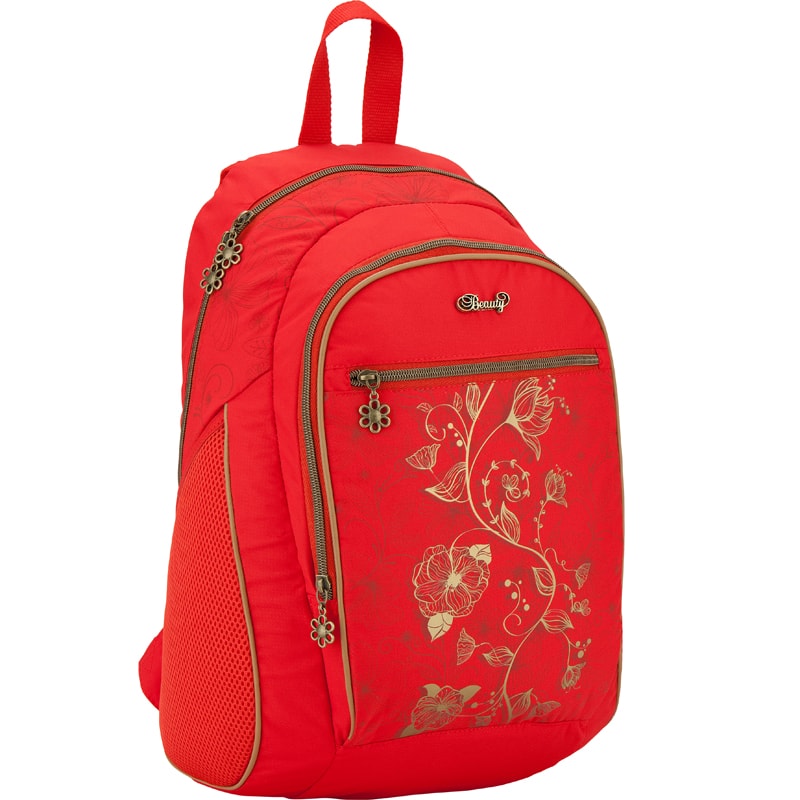 Удобный, легкий рюкзак из мягкой приятной ткани красного цвета с легким цветочным рисунком, имеет бежевую подкладку. Рюкзак предназначен для внешкольного досуга девочек среднего и старшего школьного возраста.