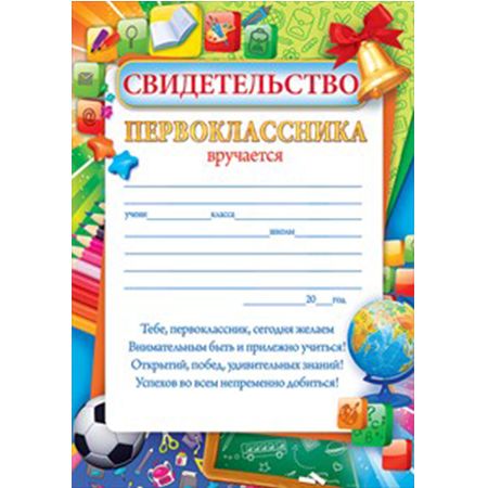 Оригинальное свидетельство, с помощью которого, вы сможете поздравить своего ребёнка или ваших любимых учеников, с поступлением в первый класс. На бланке есть стихотворное поздравление, и поля для заполнения.