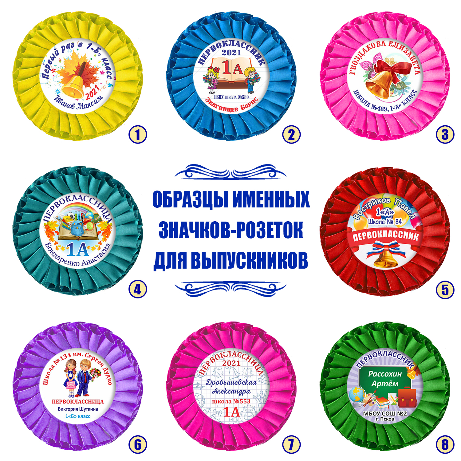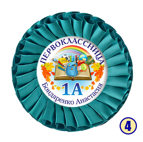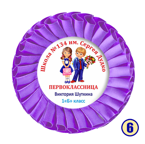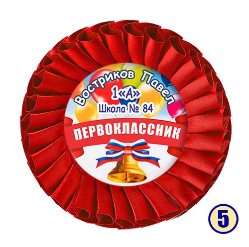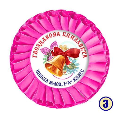 Значок-розетка изготовлен из атласной ленты, серединка - из металла и прочного пластика с яркой картинкой.