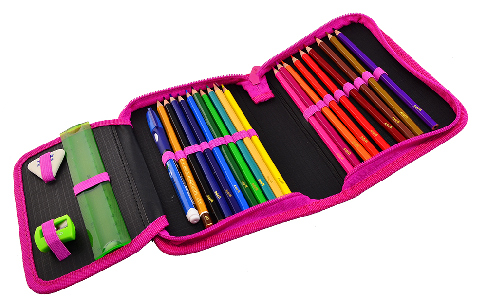 Пенал вместительный и в нём может разместиться большое количество разнообразных канцелярских предметов. Внутри пенала есть специальные резиночки-держатели для карандашей, ручек, фломастеров и других пишущих принадлежностей.